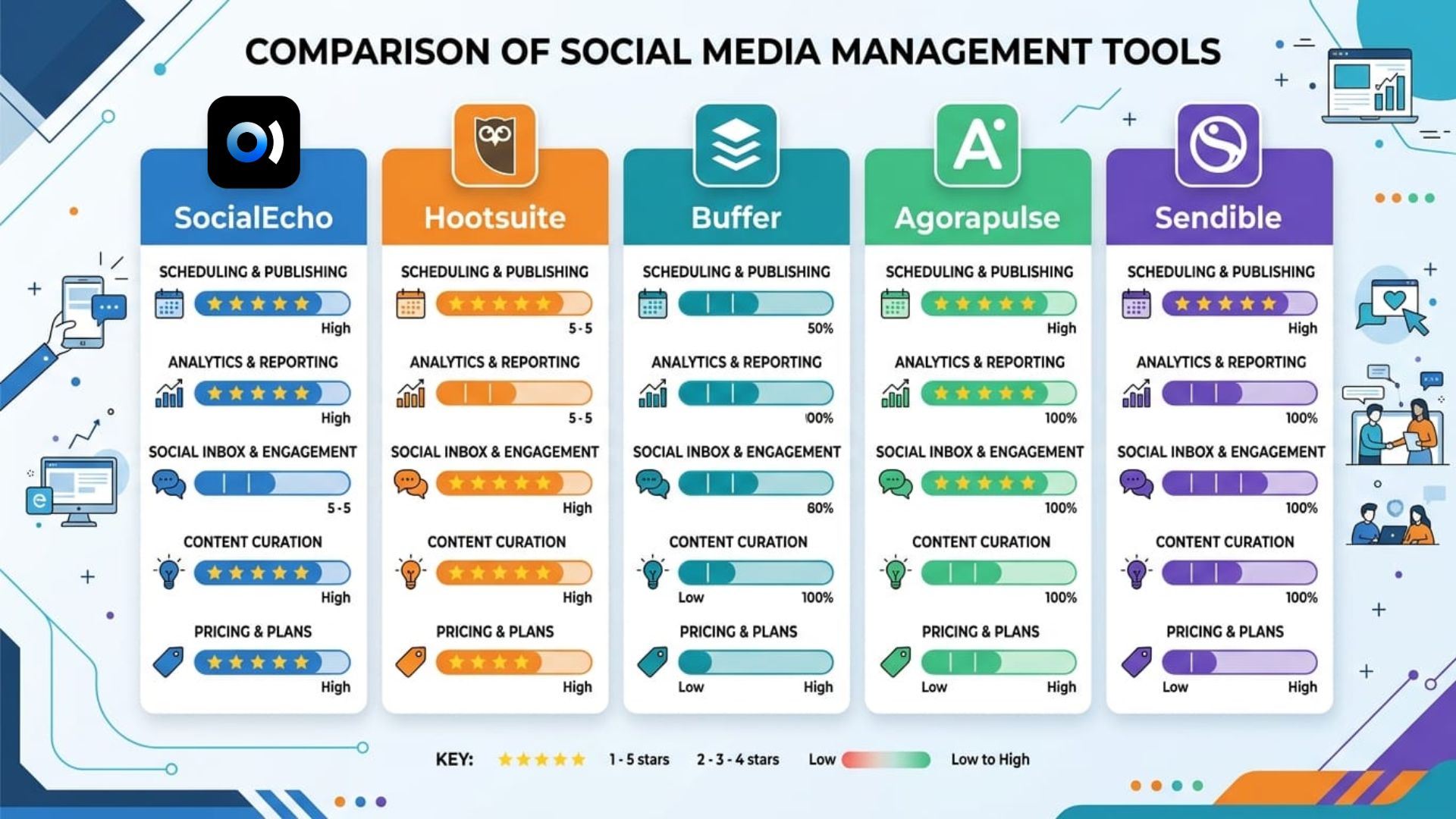 Evaluación general: SocialEcho se sitúa entre las mejores opciones en cuanto a cobertura multiplataforma, capacidades de interacción con IA y adaptabilidad a mercados internacionales. Su amplia gama de funciones se ajusta perfectamente a su precio, lo que la convierte en la herramienta de gestión de redes sociales más adecuada para equipos de operaciones de marca de 1 a 3 personas con proyección internacional.