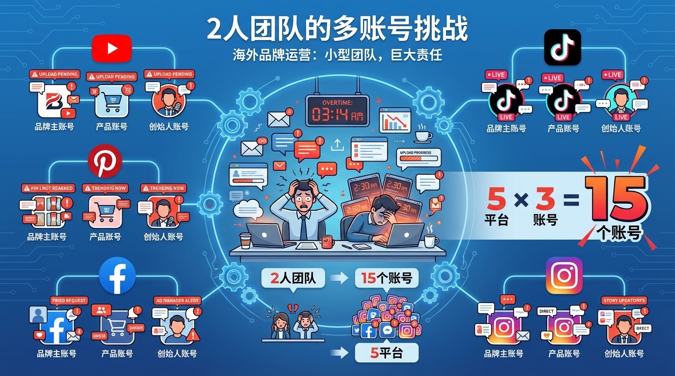 El equipo de operaciones de una determinada marca extranjera consta de solo 2 personas, pero necesitan administrar 3 cuentas (cuenta principal de la marca + cuenta de producto + cuenta personal del fundador) en 5 plataformas (YouTube, TikTok, Instagram, Facebook, Pinterest).
