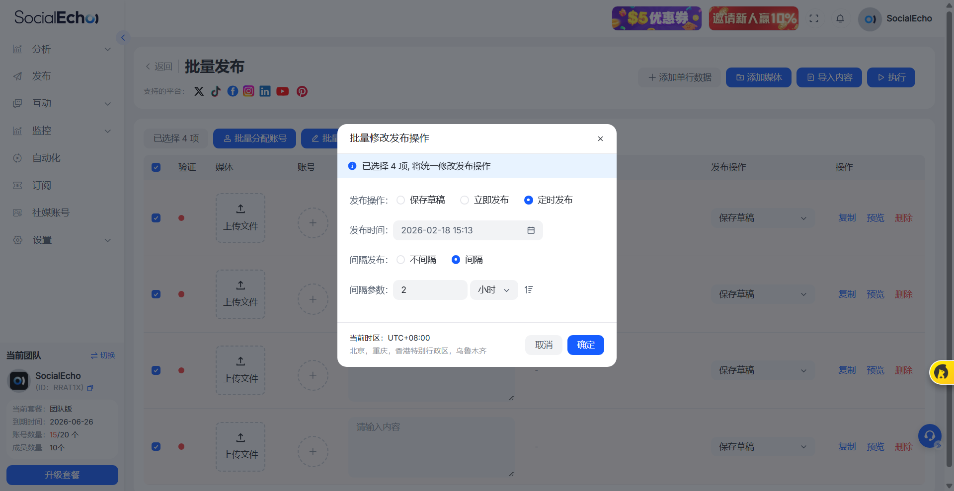 Herramienta : Utiliza la Cola Inteligente de SocialEcho . Configura intervalos de publicación, como publicar una cada dos horas, en lugar de publicar todas a la vez. Esto mantiene tu cuenta activa durante todo el día sin activar el sistema de control de frecuencia.