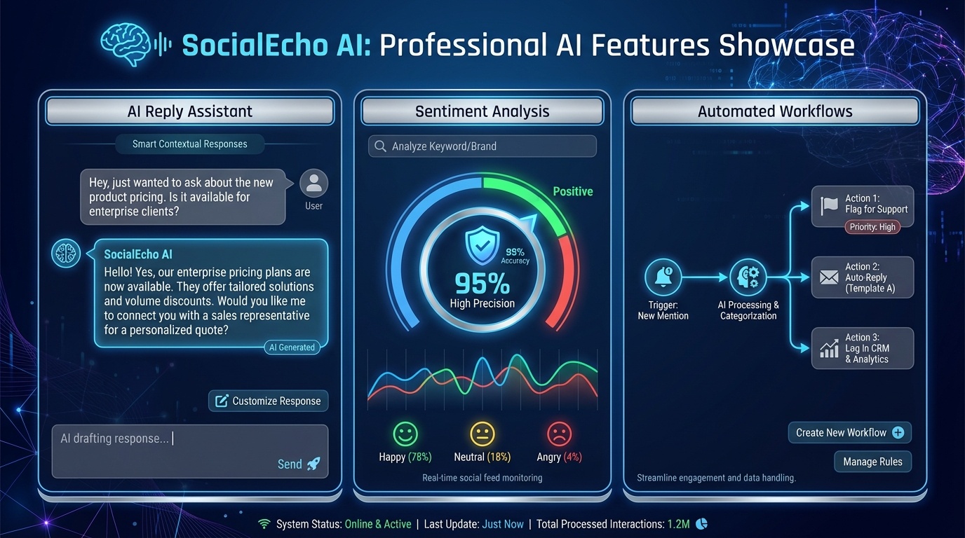 En términos de interacción del usuario, puede utilizar el asistente de respuesta de inteligencia artificial de SocialEcho para responder automáticamente a las preguntas frecuentes e identificar automáticamente las emociones e intenciones.