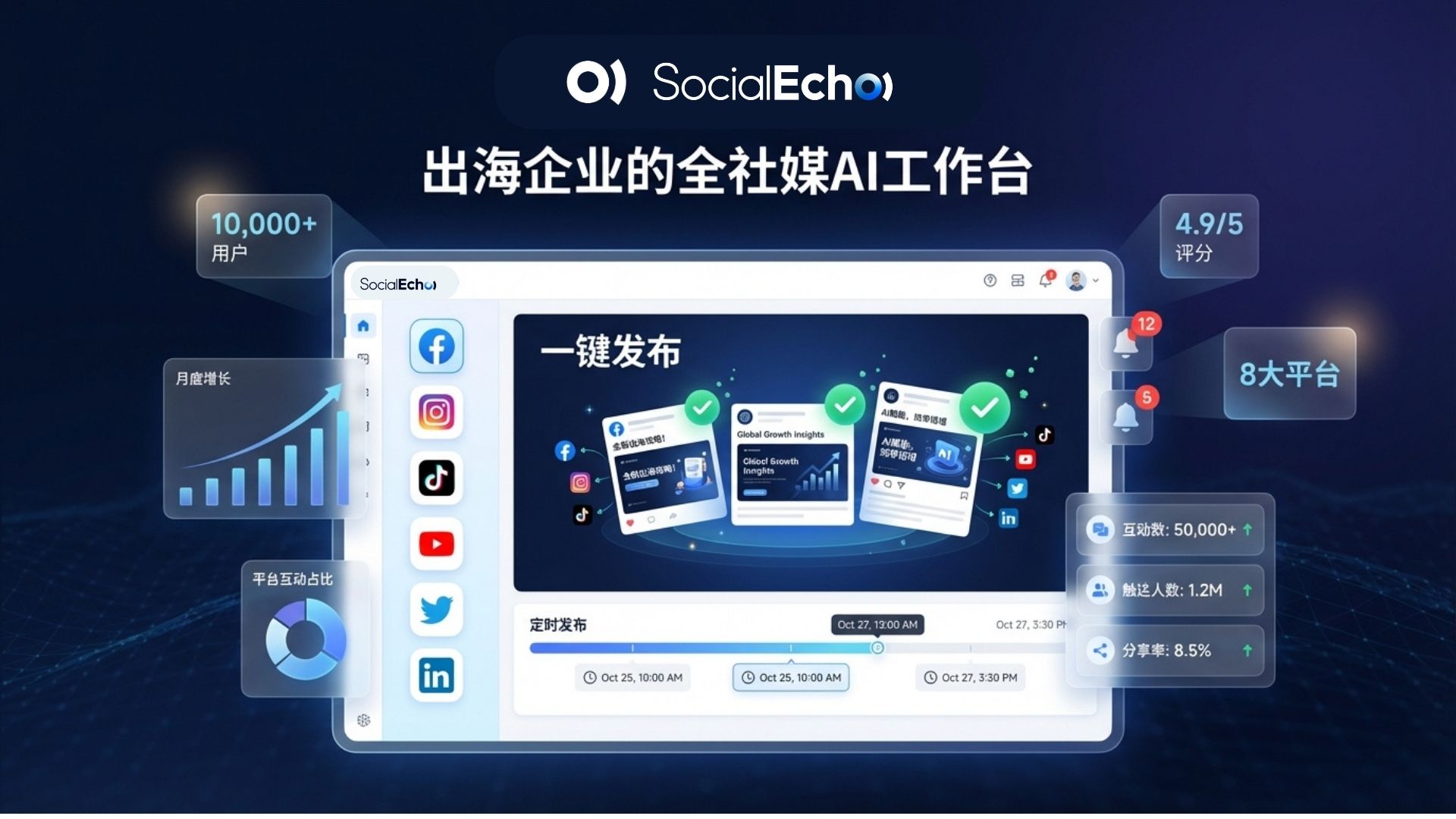 SocialEcho es una plataforma integral de IA para redes sociales para empresas que se expanden internacionalmente. Es compatible con ocho plataformas principales, como TikTok, Instagram, YouTube, Twitter y LinkedIn, y ofrece soluciones integrales para la publicación de contenido, la gestión de interacciones, el análisis de datos y la automatización de IA.