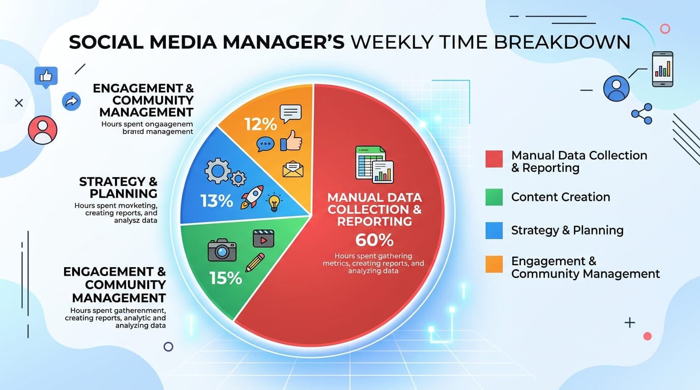 Quizás pienses que tu equipo no es lo suficientemente eficiente o que no dominas las herramientas. Pero el informe "Estado del marketing en redes sociales 2025" de HubSpot revela una cruda realidad del sector: más del 60 % de los gestores de redes sociales afirman dedicar más de 5 horas semanales al procesamiento de datos y la generación de informes, un trabajo casi totalmente repetitivo que no genera ningún valor estratégico. La investigación de Sprout Social es aún más directa: los equipos de redes sociales empresariales gestionan una media de 3,7 plataformas, y la integración de datos entre plataformas se sitúa en primer lugar como la tarea "más laboriosa y frustrante" en las operaciones.