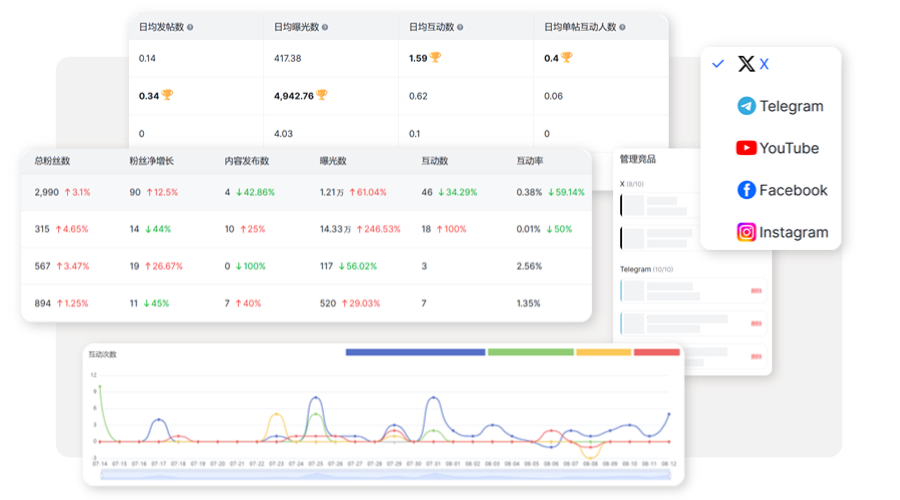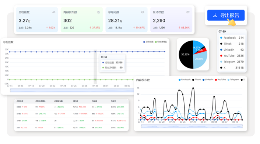 粉丝数、内容量、曝光量、互动量……所有平台数据实时汇总一屏呈现,社交矩阵表现一目了然。
