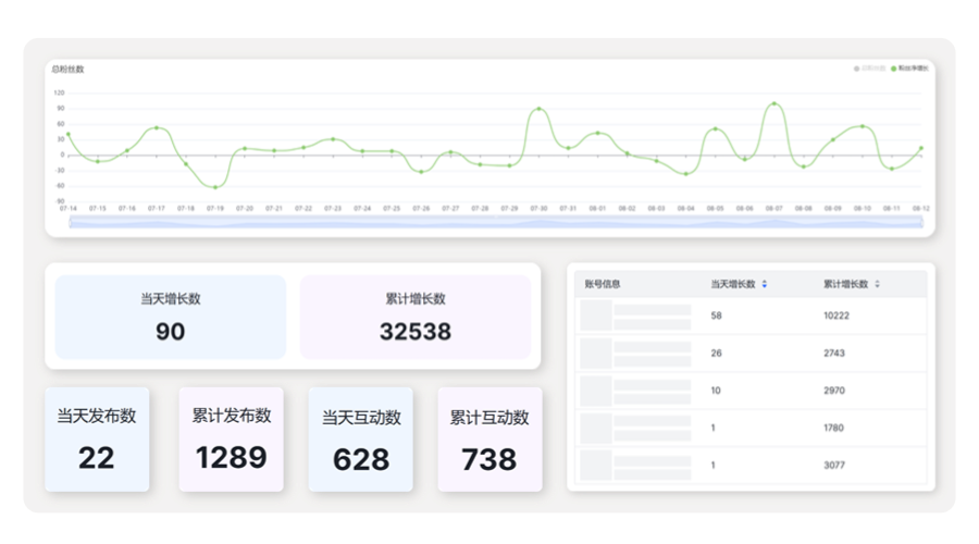 数据追踪细化至每天,支持查看历史数据,帮品牌清晰把握账号的涨粉、互动等关键趋势,及时发现变化,快速验证策略结果,缩短内容试错周期,精准分配投放预算。